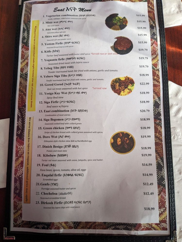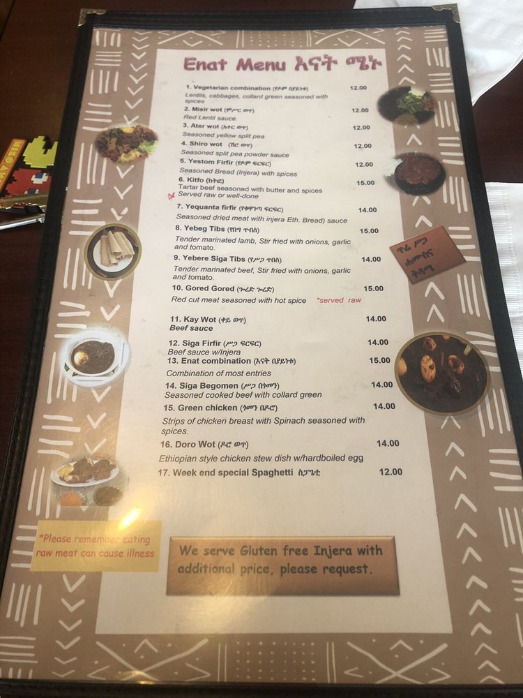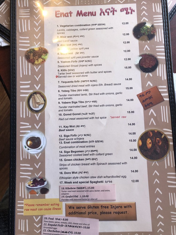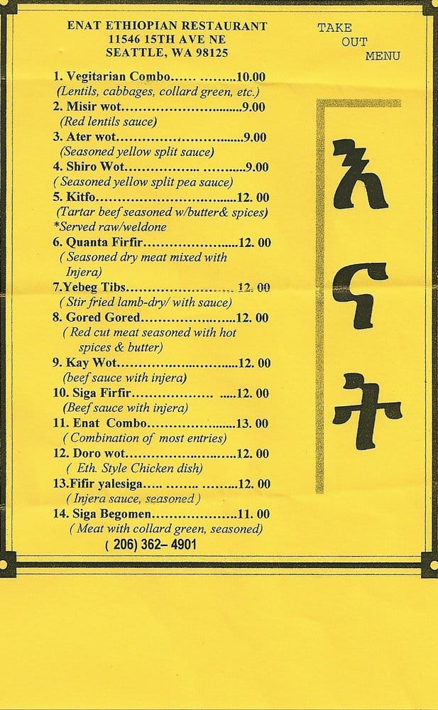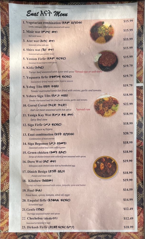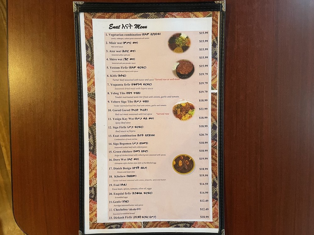 Enat Ethiopian Restaurant in Seattle offers a variety of traditional Ethiopian dishes, including the popular Vegetarian Combination and Kitfo. With options for both meat lovers and vegetarians, Enat provides generous portions with flavorful and well-seasoned dishes. Customers praise the quick service, peaceful ambiance, and the community vibe within the restaurant. The restaurant's menu also includes appetizers like Sambusa and desserts like Baklava. Diners appreciate the freshness of the injera and the balance of flavors in their dishes, along with the option to enjoy honey wine. For those new to Ethiopian cuisine, the Enat combo is a recommended starting point. Overall, Enat Ethiopian Restaurant provides a satisfying dining experience with delicious food, friendly service, and a welcoming atmosphere.